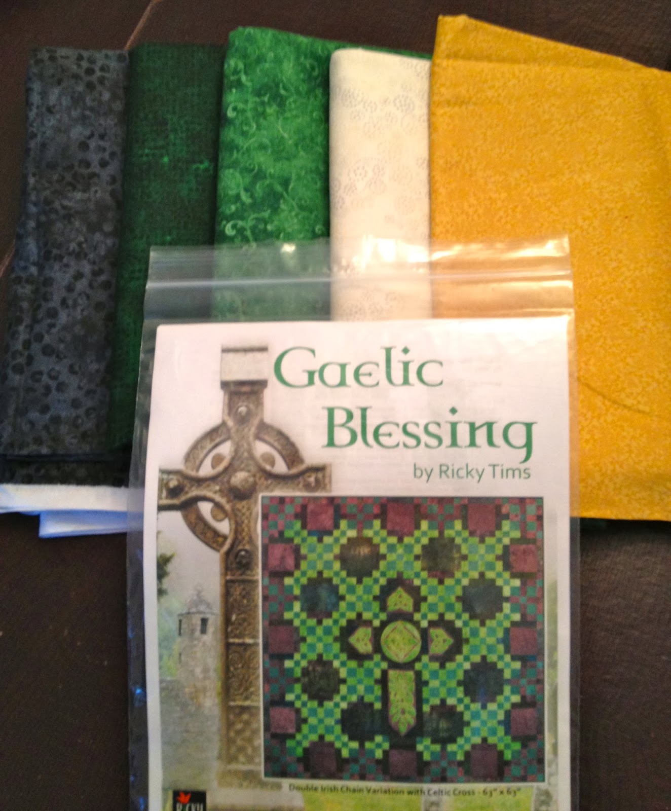 It's been a week since I last posted. I'd like to be able to say I have accomplished quite a bit in the past week, but that wouldn't be true. I did go on a mini fabric shophop on Saturday in search of just the right fabrics for this upcoming project. I've been looking all over for the right greens or at least the ones that I had pictured in my mind. The pattern is Gaelic Blessingss by Ricky Tims. It's a double Irish chain with variations and a Celtic cross. Besides these two gorgeous greens, I will use a tone on tone cream, charcoal, and a warm gold for the cross. The cross will be machine appliquéd and may not be this gold that I have in my stash. I won't be able to start on this project for a while; perhaps I will get it all cut and then bring it with me on a quilt getaway weekend next month.
